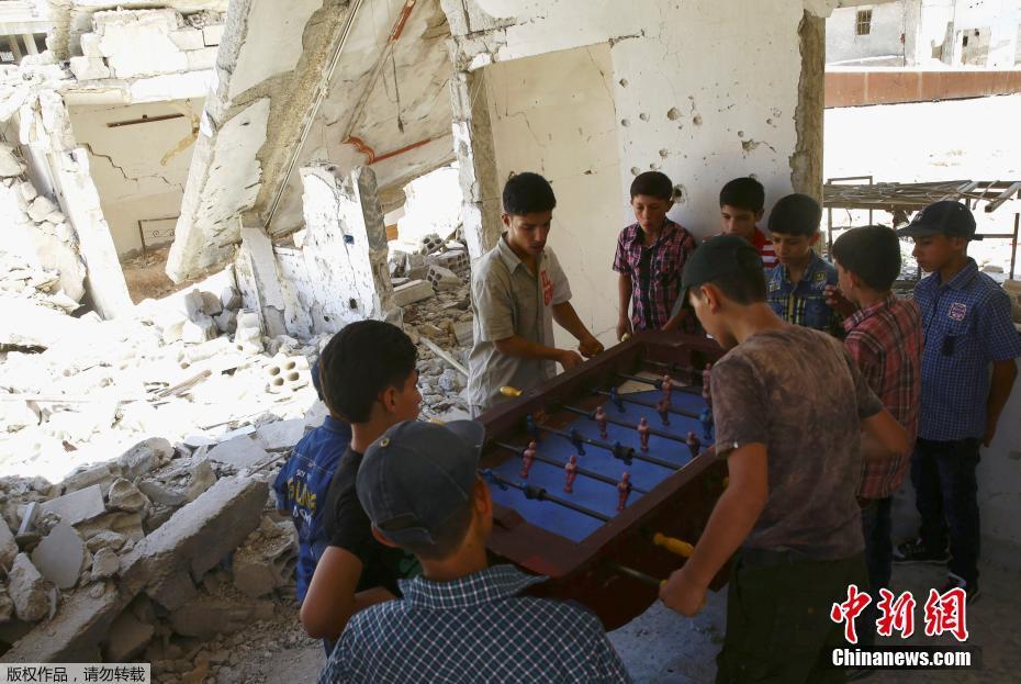 當地時間2017年6月26日,敘利亞反對派控制區杜馬,男孩在廢棄的建筑內玩桌上足球慶祝開齋節。