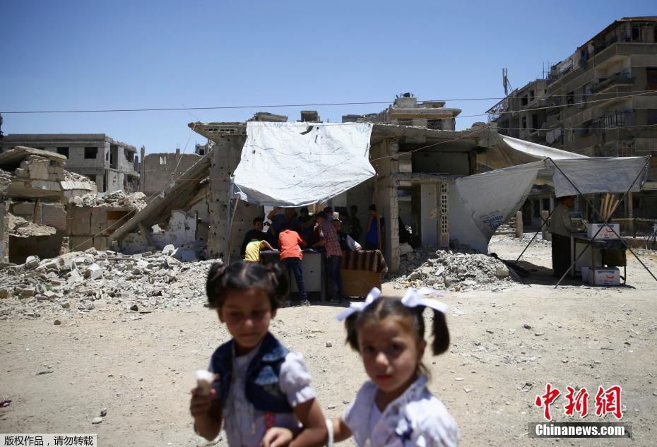 當地時間2017年6月26日,敘利亞反對派控制區杜馬,兒童在臨時的游樂園玩玩耍慶祝開齋節。