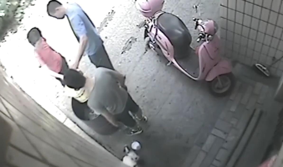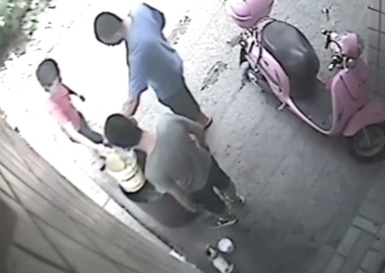 “然后我們以為那個小狗,那個桶那么高,它怎么能跳進去。然后我們就調監控,發現是鄰居家小孩做的。”圖為男童抓起小狗將其扔進火盆。