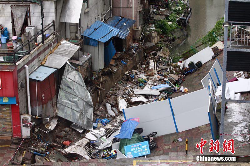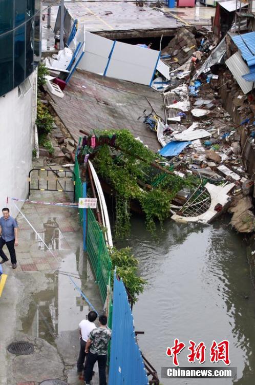 7月18日,深圳普降大暴雨局部特大暴雨,致部分路段嚴重積水、山體滑坡道路中斷、交通擁堵等險情。深圳鹽田區盤山公路恩上路段出現滑坡,無人員、車輛被困;深鹽二通道下沙頭角出口匝道中間因山水傾瀉,道路中斷,交警已經實施了交通管制。當地氣象部門先后發布了雷電、暴雨黃色、暴雨橙色和暴雨紅色分區預警信號。圖為深圳寶安區西鄉永安商業城門前區域坍塌,長約15米、寬約6米的塌陷。中新社記者 鐘新 攝