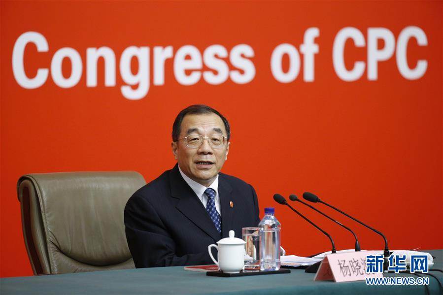 10月19日,中國共產黨第十九次全國代表大會新聞中心舉行記者招待會,請中共中央紀律檢查委員會副書記、監察部部長、國家預防腐敗局局長楊曉渡,中共中央組織部副部長齊玉介紹加強黨建工作和全面從嚴治黨情況,并回答記者提問。新華社記者 陳曄華 攝