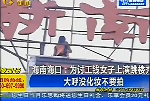 法制晚報:【女子跳樓見記者拍攝:“我沒化妝不要拍”】近日,海口一名女子為討工錢上演跳樓秀。她坐在大樓樓頂的廣告牌前,用手抓住廣告牌鐵架,神情激動。警方和救護人員做好準備隨時出動救援。見到記者拍攝,女子大喊:不要拍了!我今天沒有化妝,不夠漂亮,很難看!
