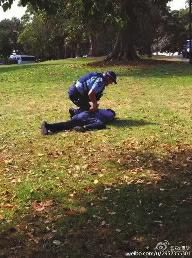 一名目擊導游說:“剛才有兩個客人在悉尼草坪上方便,讓警察看見了。警察追他們,他們提著褲子跑。他們惱羞成怒,要打警察。警察一個過肩摔,把一個男的摔地上骨折了?,F在救護車,警車都過來了。”
