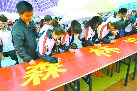 大學生在創建森林城市工作啟動儀式上簽名