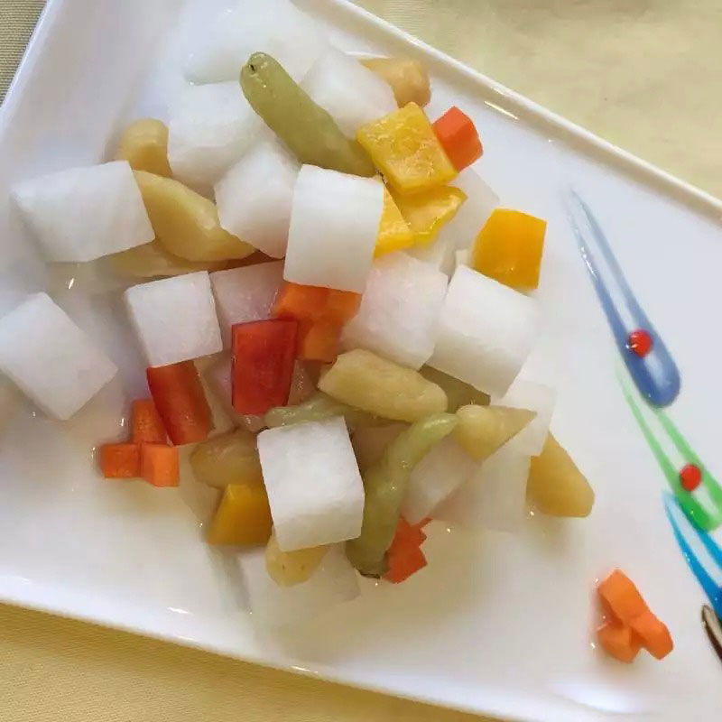 做法:象牙白蘿卜去皮切丁,仔姜和彩椒分別切丁,用白糖,白醋,玫瑰露酒調(diào)成汁,把所有原料泡進去,放冰箱腌2小時即可食用。