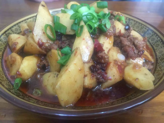 3.炒制。將肉餡加料頭炒香,加入干紅辣椒,花椒,花椒面,豆瓣醬和老干媽醬炒香,加水后放入山藥,加鹽,白糖,蠔油,甜面醬調味。