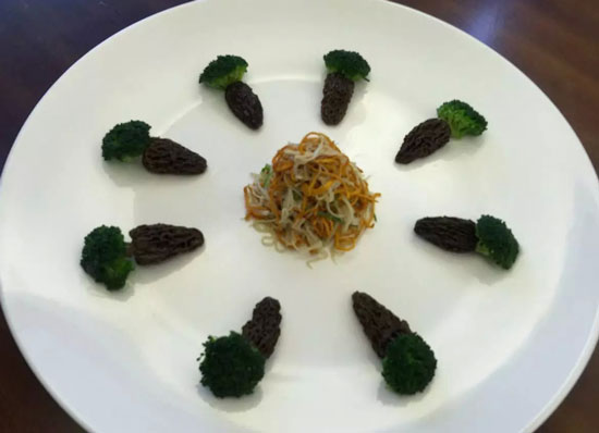 4.把西蘭花和羊肚菌勾芡后擺盤即可。