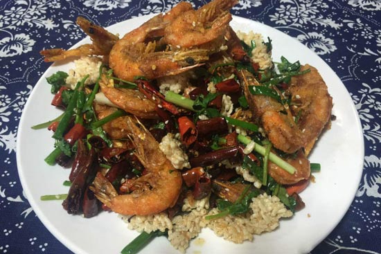 6、鍋內留少許底油,將花椒和干紅辣椒炒香,倒入鍋巴和蝦,調味后翻炒即可。