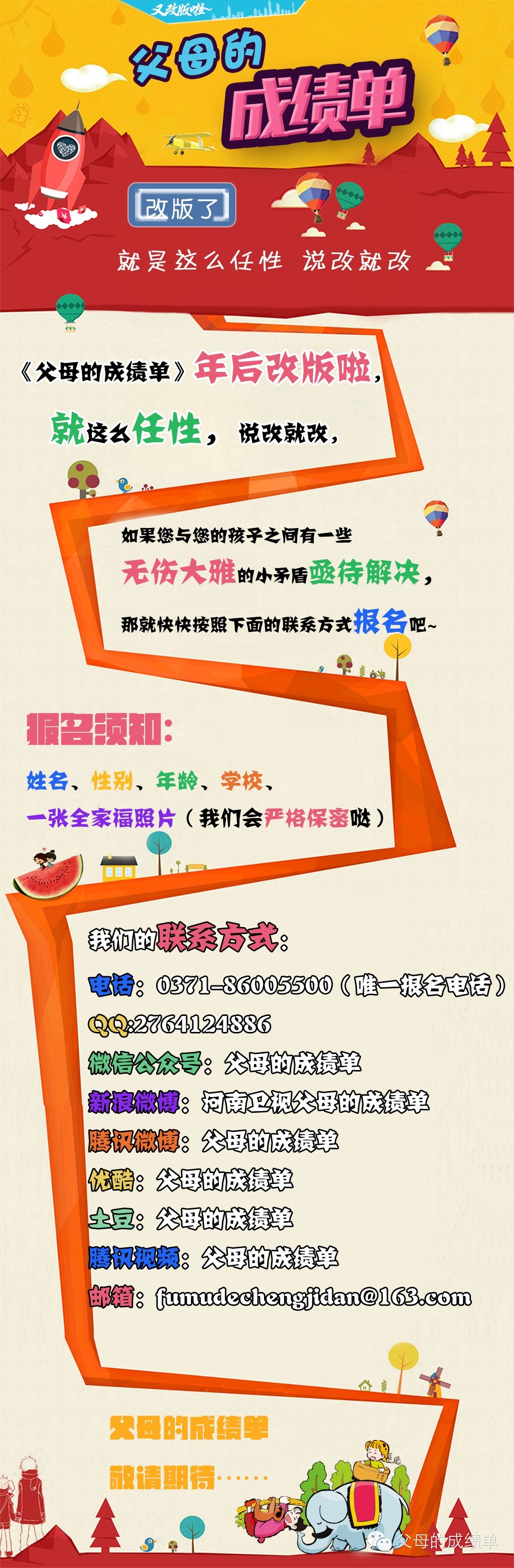 年后,經(jīng)過導(dǎo)演大大和眾小編們的熱切商討,《父母的成績單》又改版啦。我們就是這樣任性,說改就改,為了什么?為了讓可敬可愛的觀眾朋友們看到更優(yōu)質(zhì)更具有內(nèi)涵的節(jié)目,希望你們能喜歡我們的節(jié)目,能感受到我們每一位幕后工作者的用心付出。我們真誠的期望每一位家長都能耐心的用更好的方式來與您的孩子溝通相處,更期望每一位孩子都能健康快樂的成長。
