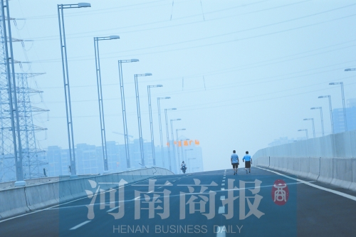 在鄭州市南三環京廣路口向南的高架橋上鍛煉玩耍的人很多。