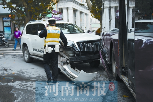 26日下午1點(diǎn)10分,在鄭州市花園路與緯一路交叉口東南角,一輛白色越野車與一輛紅色公交車“如膠似漆”。越野車整個(gè)前保險(xiǎn)杠脫落,而公交車右后輪的護(hù)板掉落。