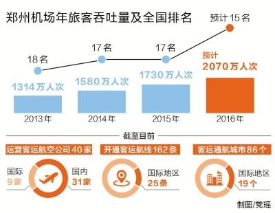 據(jù)鄭州機場相關負責人介紹,2014年鄭州機場旅客吞吐量突破1580萬人次,同比增長20%,增速位居全國20個大型機場首位。