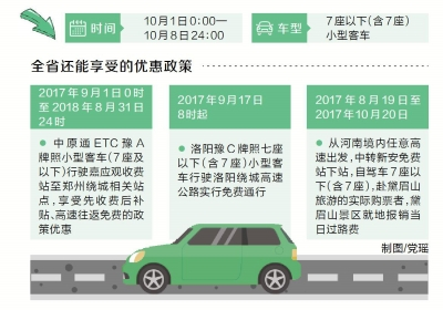 同時,全省還能享受到除高速免費以外的其他優惠政策:從2017年9月1日0時至2018年8月31日24時,中原通ETC豫A牌照小型客車(7座及以下)行駛嘉應觀收費站至鄭州繞城相關站點,享受先收費后補貼、高速往返免費的政策優惠;2017年9月17日8時起,洛陽豫C牌照7座以下(含7座)小型客車行駛洛陽繞城高速公路實行免費通行;2017年8月19日至2017年10月20日,從河南境內任意高速出發,中轉新安縣下站,自駕7座以下(含7座)小型客車赴黛眉山旅游的實際購票者,黛眉山景區就地報銷當日過路費。